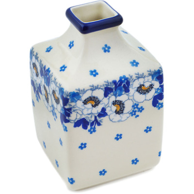 This polish pottery vase (item number H1667M) is made by talented artisans from Poland. It is 5.8" high and measures 2.3" by 3.3". It holds 13 ounces of fluid. The weight of this vase is 0.83 lbs.